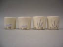 釜戸長石と合成灰のテストです。 左から、 合成土灰・合成わら灰 合成栗皮灰・合成柞灰 100:5(重量比) |