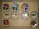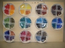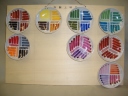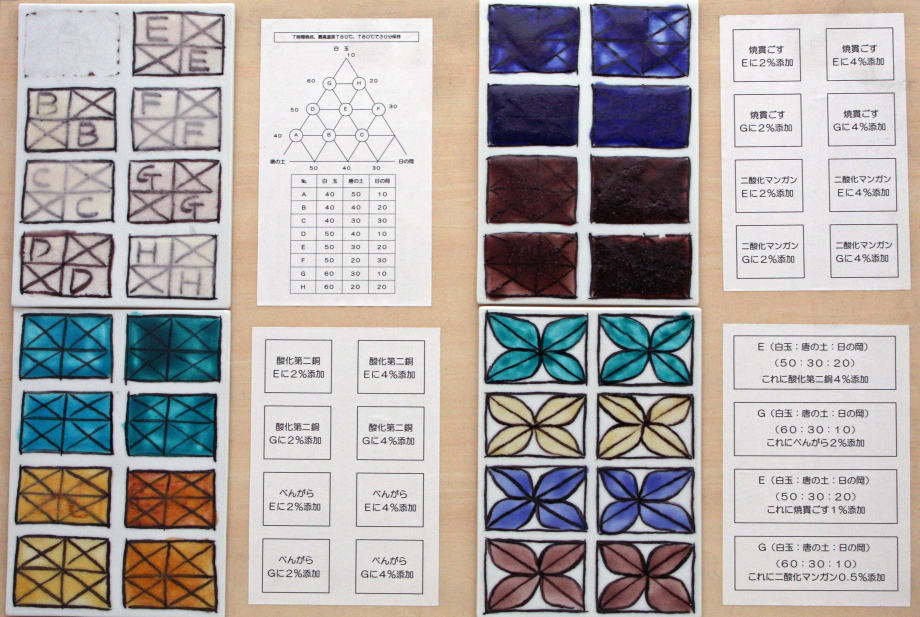 | 白玉粉(無鉛フリット)・唐の土(鉛白)・日ノ岡石粉を用いて和絵具のテストをしました。 三角座標でベースを選定し、その中から、着色金属との相性を探りました。 焼成温度は780℃、30分キープです。 青・・・・・・酸化銅 黄・・・・・べんがら。 紺・・・・・・焼貫呉須 紫・・・・・仮焼二酸化マンガン |