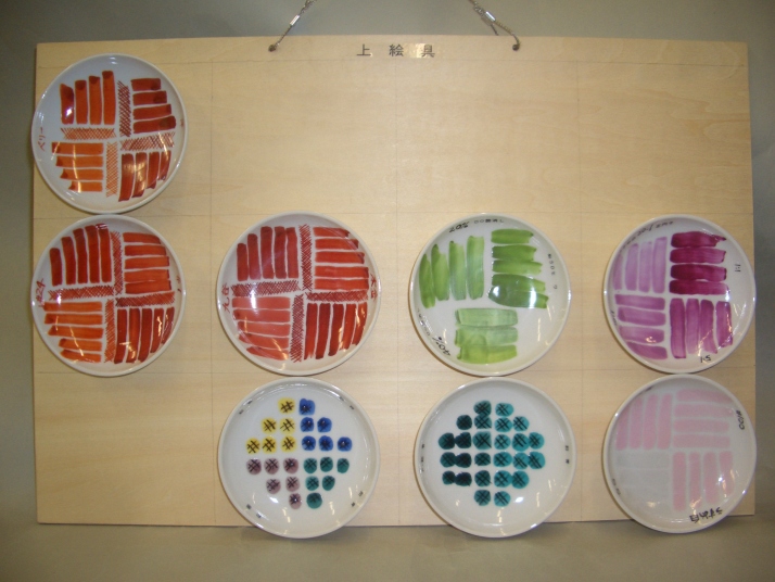 | 上絵盛絵具のサンプルです。 盛絵具を布海苔液(10倍溶液)で練って、イッチンで盛っていきます。 昔は、イッチンと渋紙を用いて盛っていましたが、良い渋紙が無いので マヨネーズ容器を利用しています。 昔、絵付の職人さんが教えてくれた事です。 |