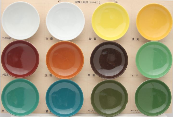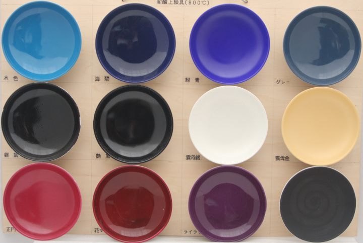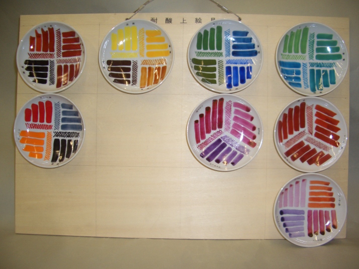 | 店頭に置いてある上絵具のサンプルをより見やすくしたくて、作りました。 線描き、べた塗り、絵具の濃淡により発色が変わります。 左から、上絵具(含鉛)。 上絵具鉄赤濃淡、艶消し パステル、和絵具。 耐酸上絵具。 無鉛上絵具、金銀液 |