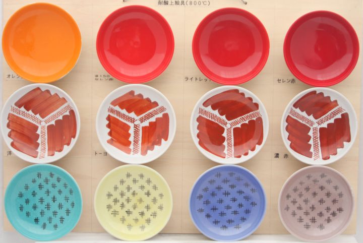 | 耐酸上絵具のサンプルです。 今回は吹付けで作りました。刷毛塗りとは異なった感じになります。 洋赤トーヨー赤、濃赤は線描き、べた塗りです。焼成温度は800℃です。 |